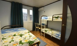 Одна двуспальная кровать, одна двухъярусная кровать, шкаф, тумбочка, телевизор, холодильник, санузел с душем, сплит-система, кухня на два номера, стол, балкон.
