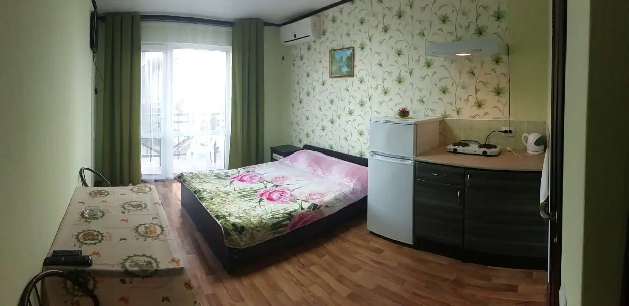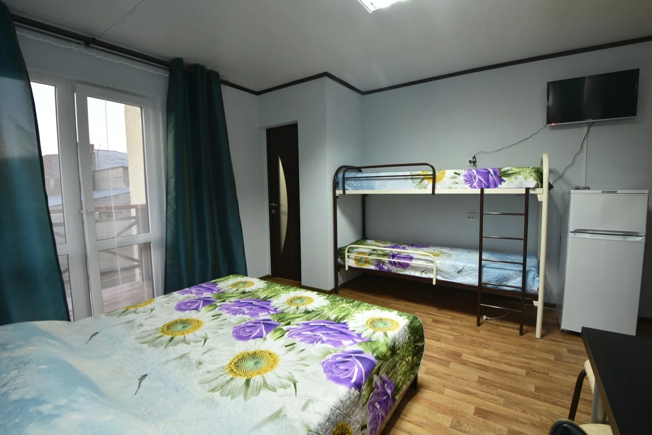 Одна двуспальная кровать, одна двухъярусная кровать, шкаф, тумбочка, телевизор, холодильник, санузел с душем, сплит-система, кухня в номере, стол, балкон.