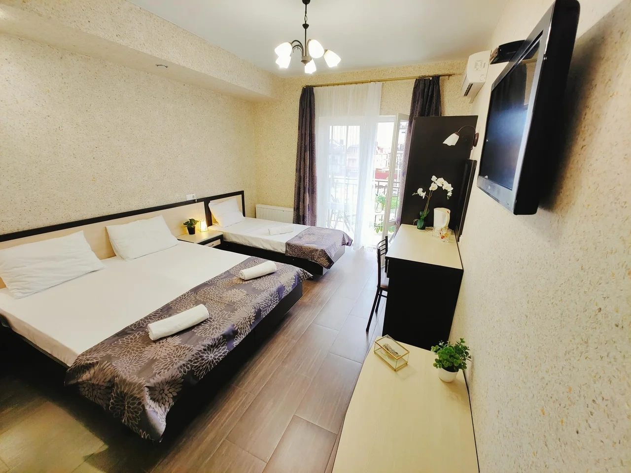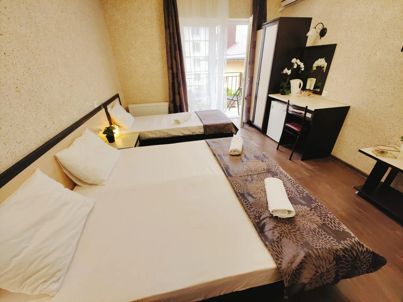 Прекрасный, светлый 3-х местный номер с балконом. В номере есть двуспальная кровать, кресло-кровать, прикроватная тумбочка, туалетный столик, шкаф, ТВ, мини-холодильник, кондиционер, сушка. В номере расположена своя ванная комната с душевой кабинкой.