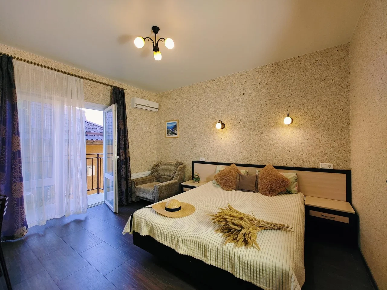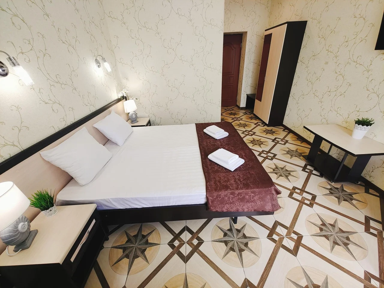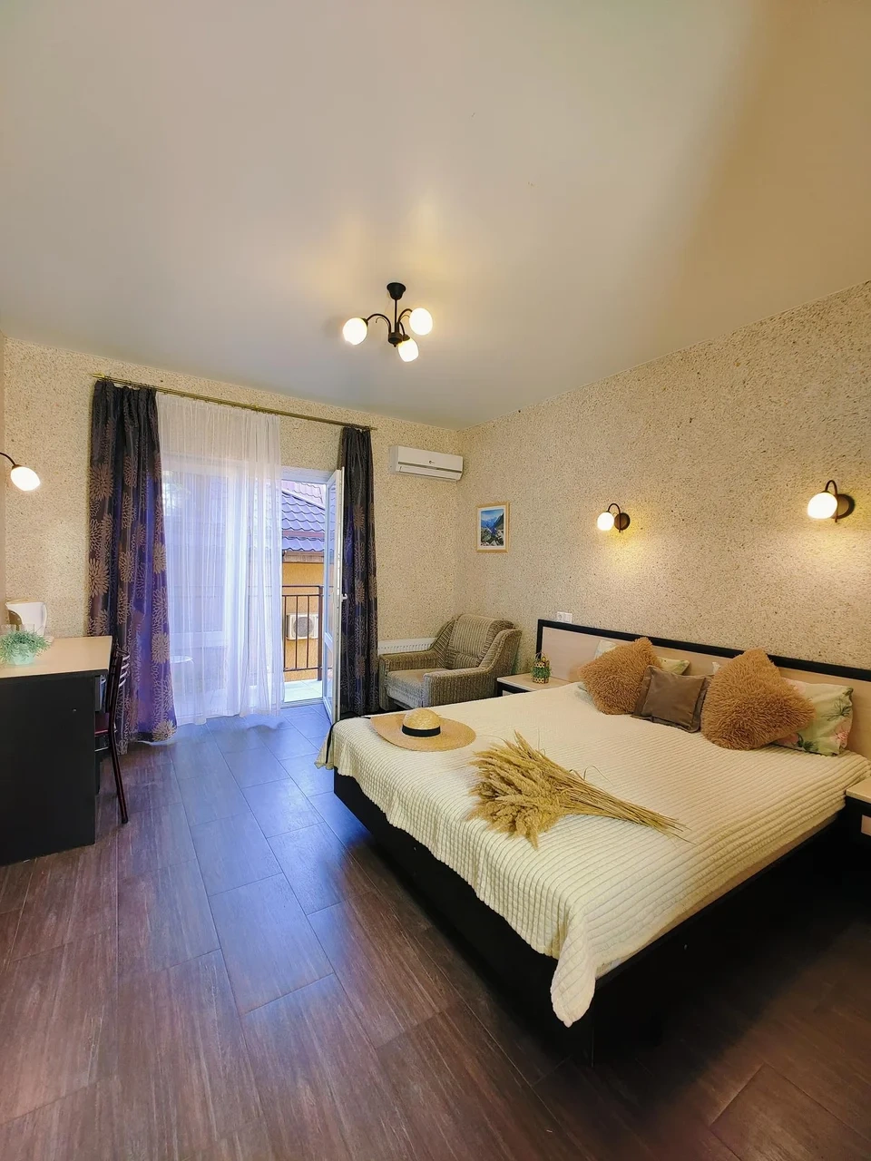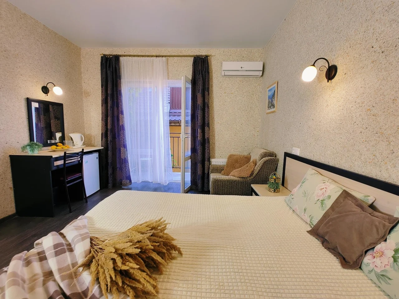 Просторный номер с двуспальной кроватью, прикроватной тумбочкой, туалетным столиком, вешалкой, шкафом. Для вашего комфорта номер оснащен кондиционером, мини-холодильником, телевизором. В номере своя ванная комната с душевой кабинкой, балкон.