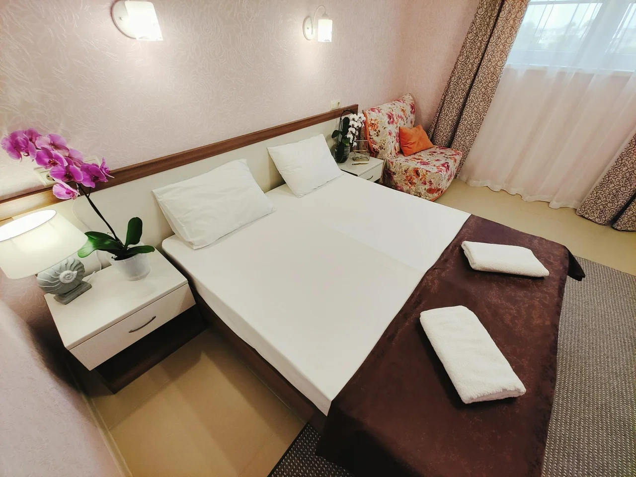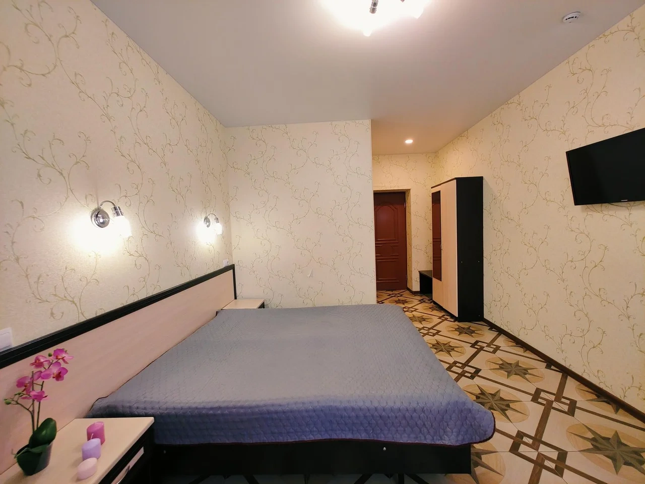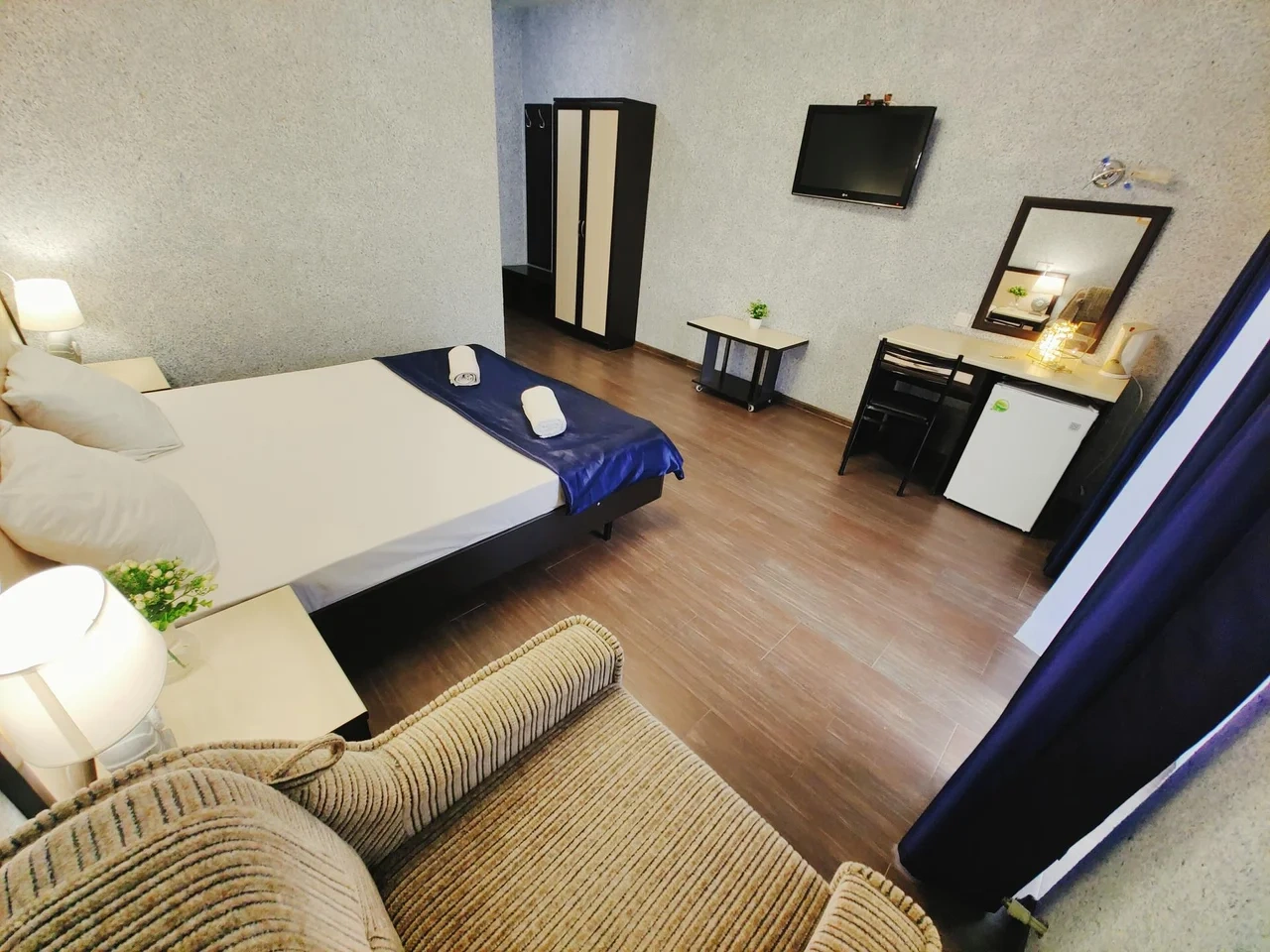 Просторный номер с двуспальной кроватью, прикроватной тумбочкой, туалетным столиком, вешалкой, шкафом. Для вашего комфорта номер оснащен кондиционером, мини-холодильником, телевизором. В номере своя ванная комната с душевой кабинкой, балкон.
