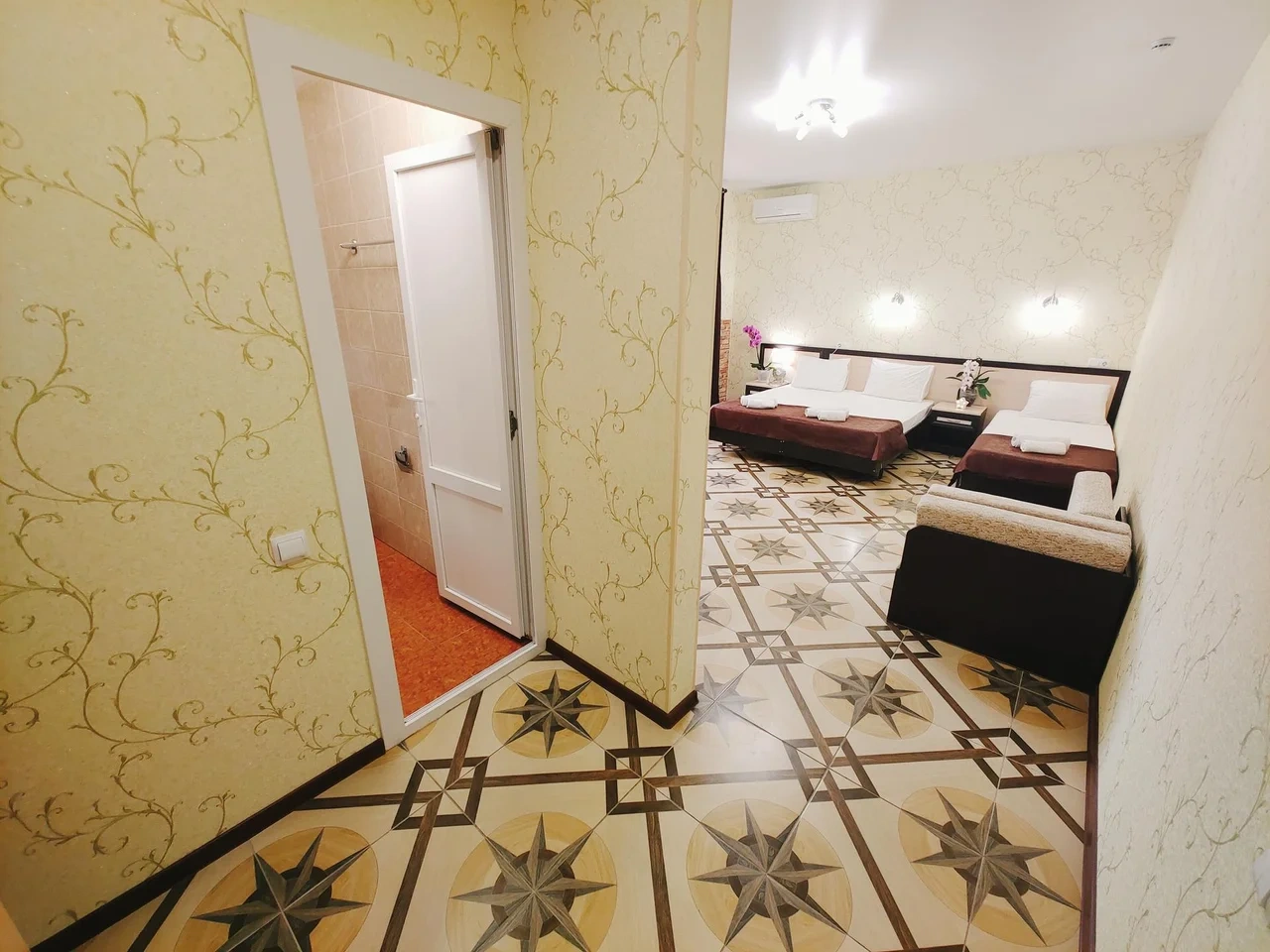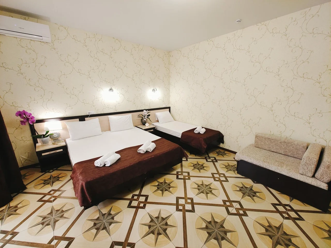 Великолепный 5-ти местный номер с балконом. В номере: двуспальная кровать, односпальная кровать, двуспальный диван (120х200), шкаф, тумбочка, туалетный столик, кондиционер, телевизор, мини-холодильник. В номере ванная комната с душевой кабинкой.