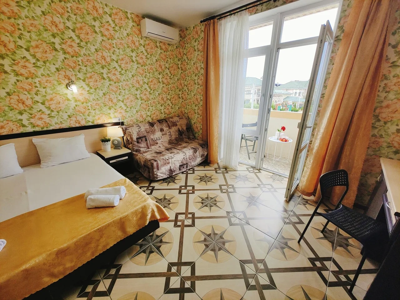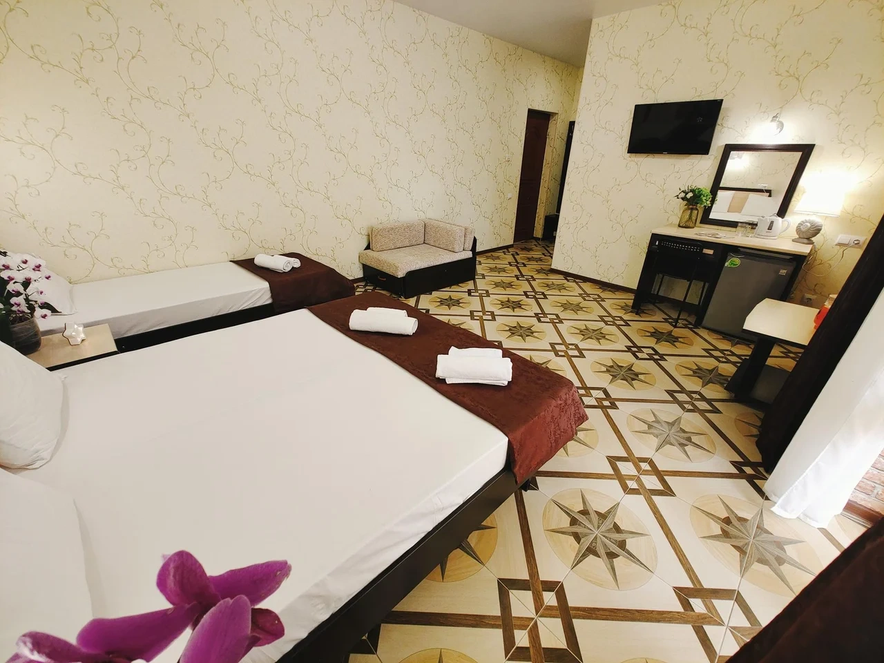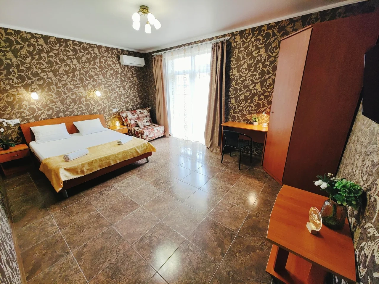 Просторный 3-х местный полулюкс с собственным двориком. В номере: двуспальная кровать, кресло-кровать, прикроватная тумбочка, туалетный столик, шкаф, ТВ, кондиционер, мини-холодильник, сушка. В номере своя ванная комната с душевой кабинкой. Индивидуальная терраса оборудована мебелью.