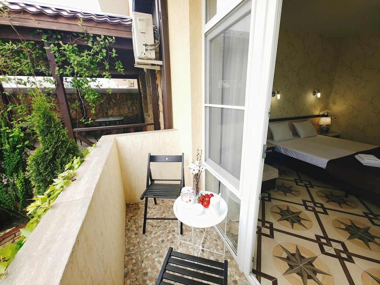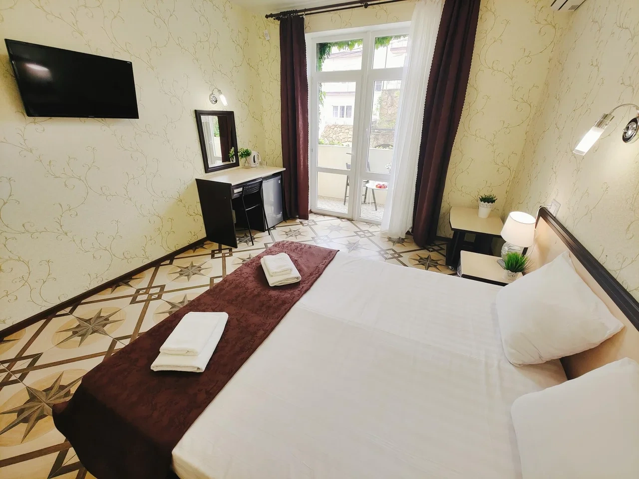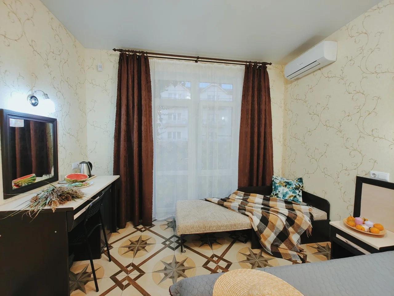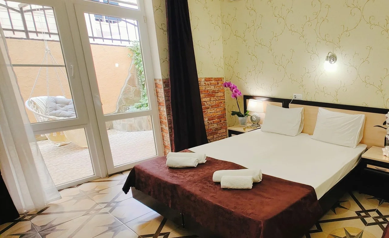 Уютный 2-х местный номер с индивидуальным двориком В номере находится: двуспальная кровать, прикроватная тумбочка, туалетный столик, шкаф, ТВ, кондиционер, мини-холодильник, чайник, сушка. Ванная комната с душевой кабинкой.