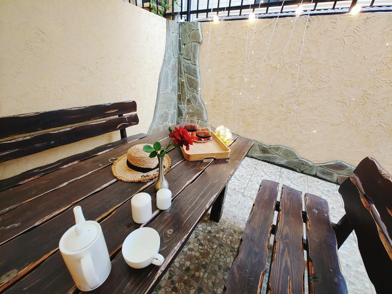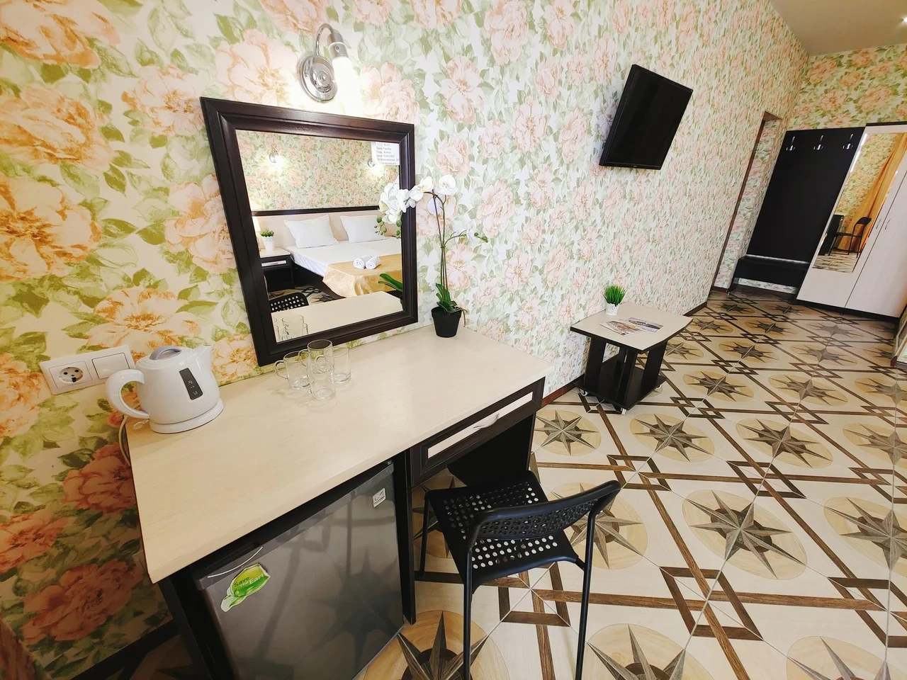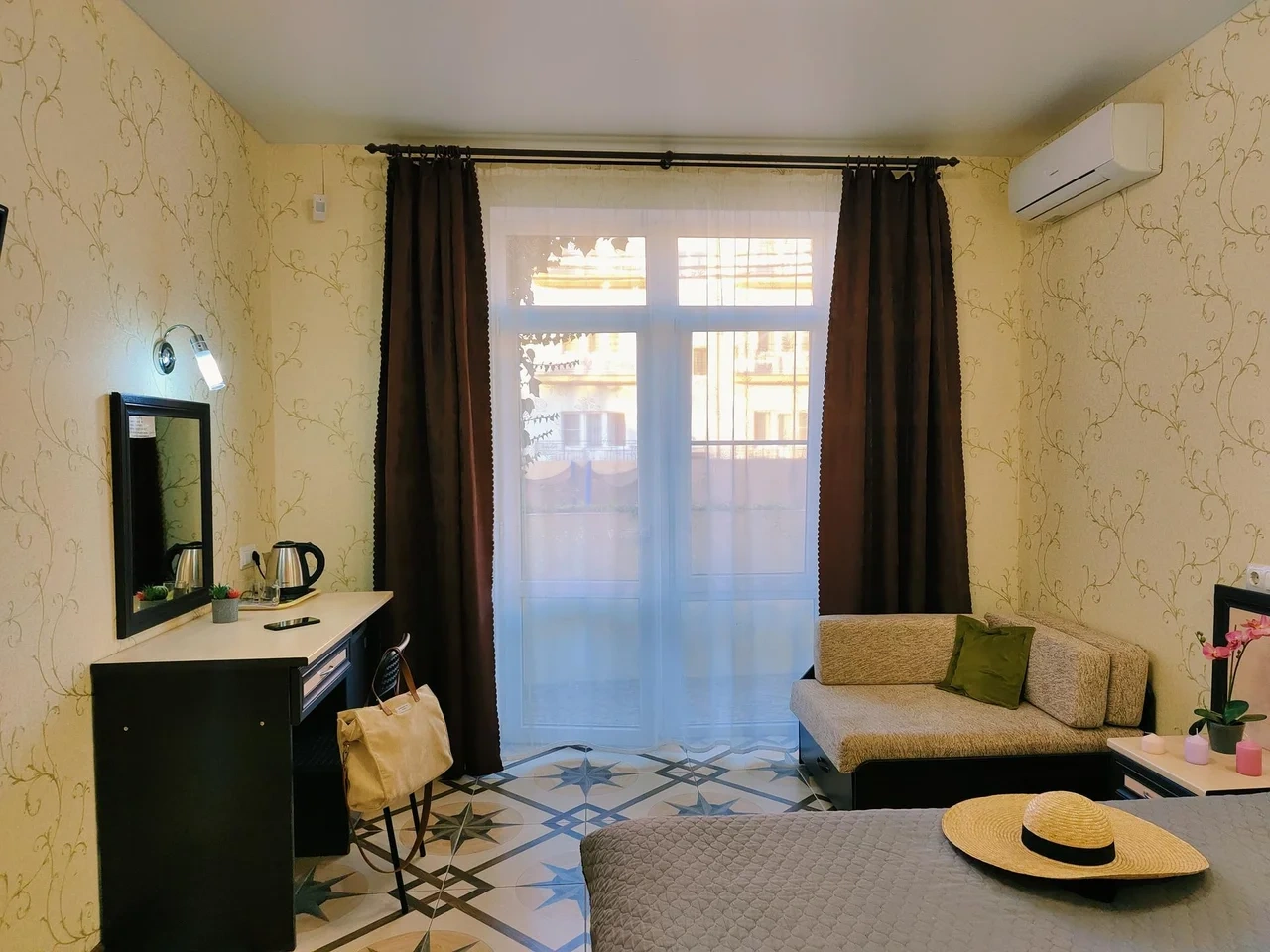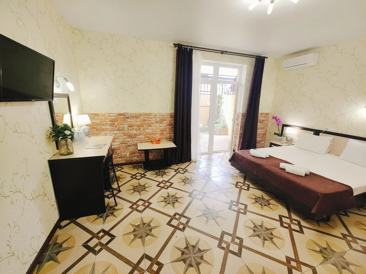 Уютный 2-х местный номер с индивидуальным двориком В номере находится: двуспальная кровать, прикроватная тумбочка, туалетный столик, шкаф, ТВ, кондиционер, мини-холодильник, чайник, сушка. Ванная комната с душевой кабинкой.