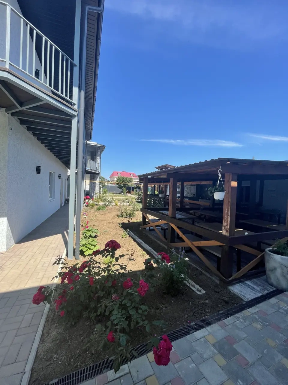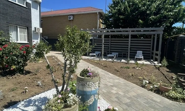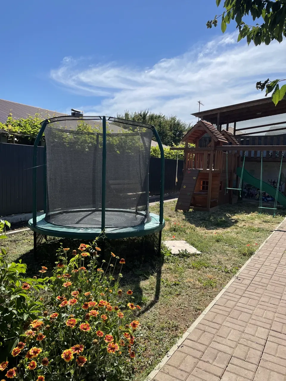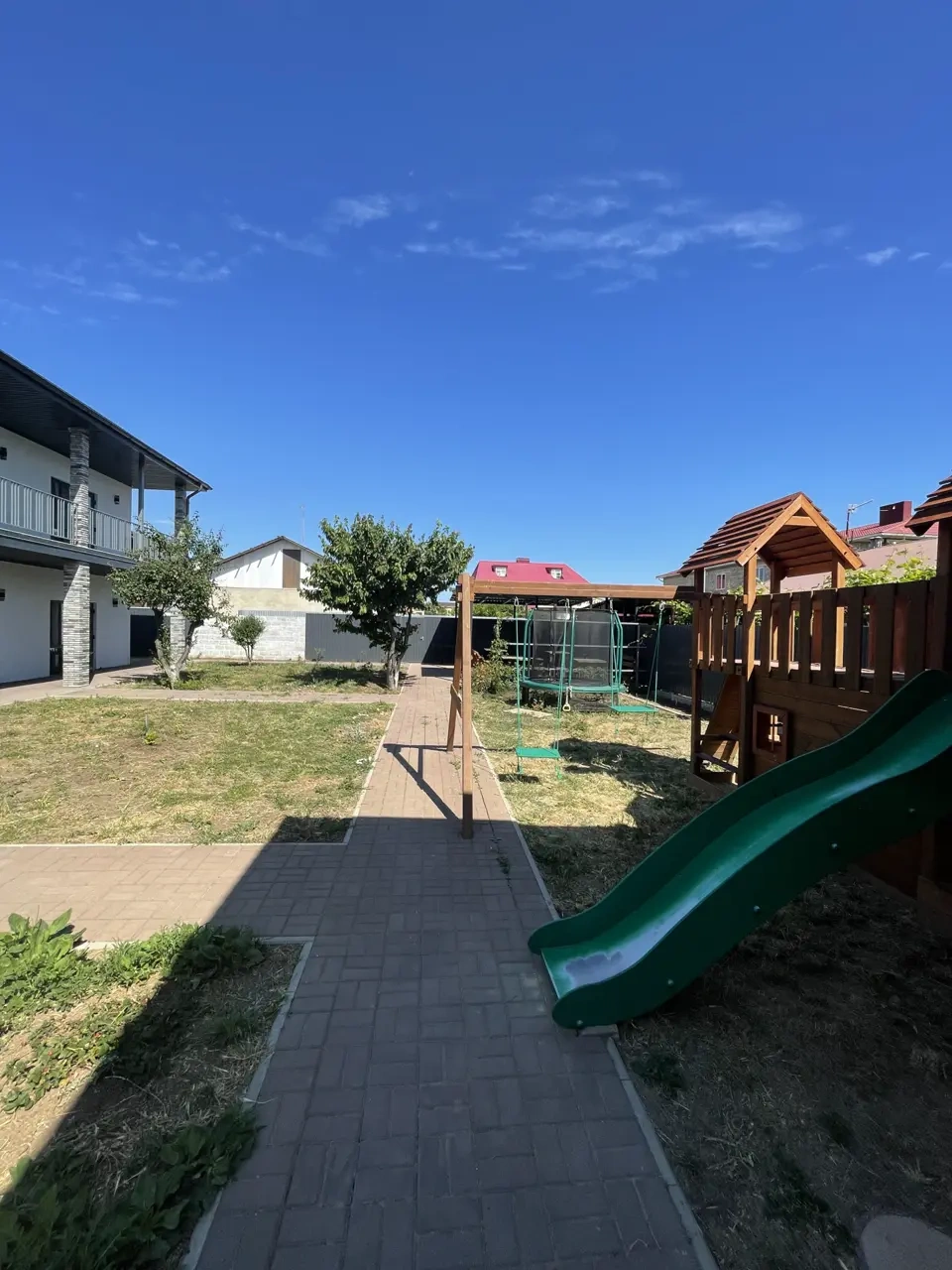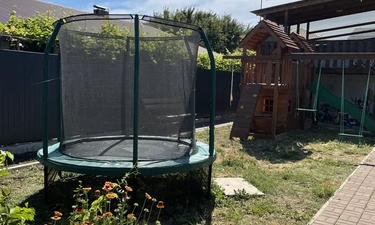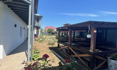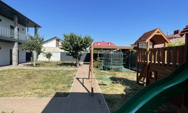 Территория гостевого дома «СОЛНЦЕ» закрытая, внутри расположена детская площадка, площадка для малышей и подростков, батут. Есть беседки для отдыха, мангальная зона, настольные игры, книги, велосипеды, самокаты. Парковочные места у гостиницы, бесплатно.