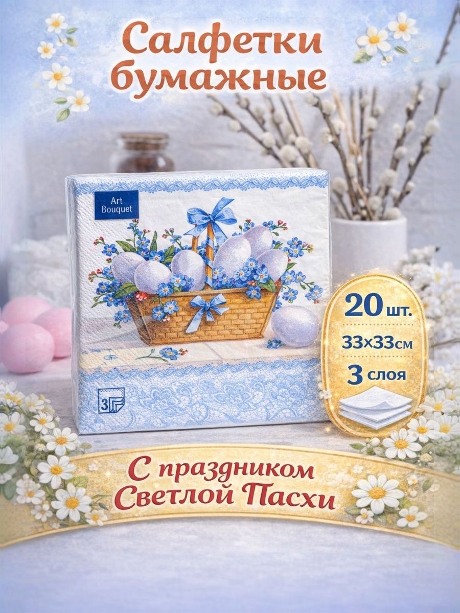 Cалфетки бумажные c рисунком "Пасхальная корзина" , 3 слоя, 33х33 см, 20 шт