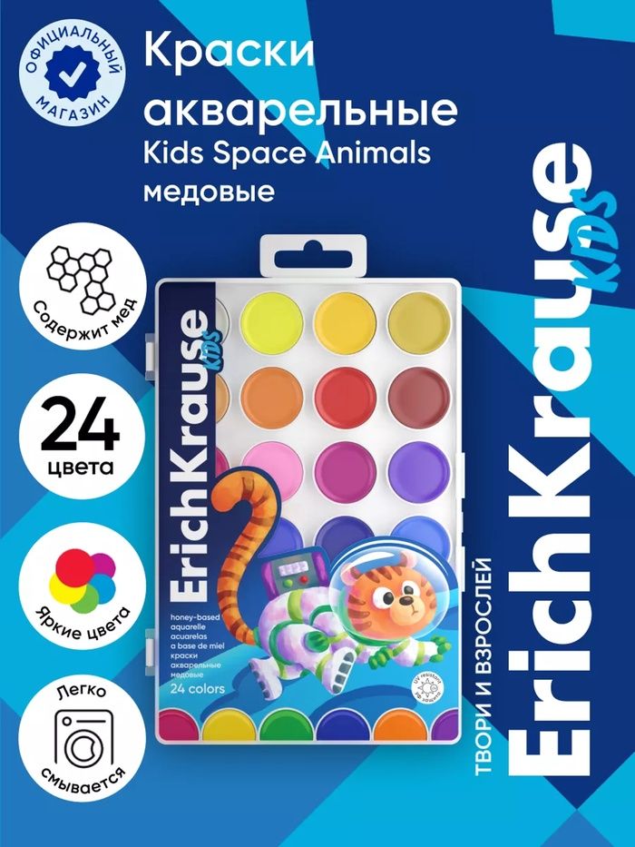 Акварель 24 цвета ErichKrause "Jolly Friends", медовые, УФ-фильтр, матовые насыщенные цвета, пластиковая коробка с европодвесом