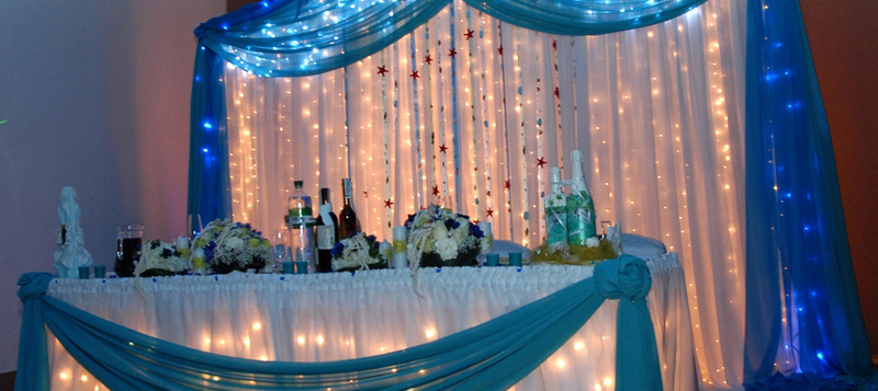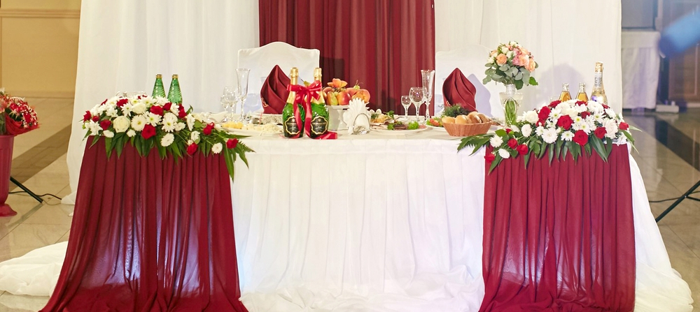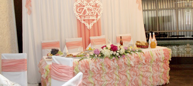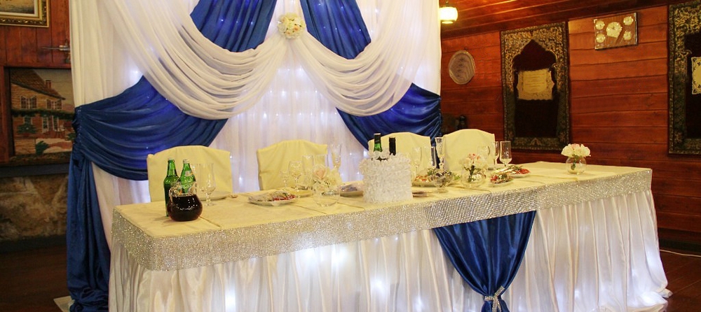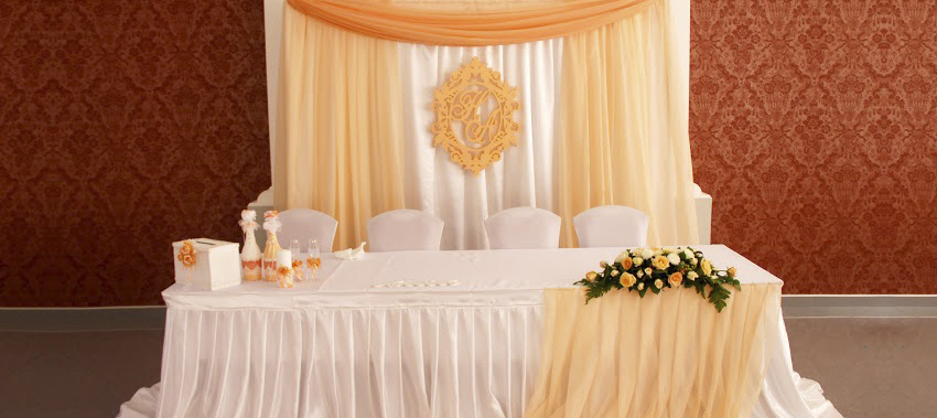На столе жениха и невесты ткань использутся в любом случае, как минимум – в качестве скатерти. Нередко текстиль становится основной идеей для декора, им оформляют задник за столом, сам президиум, стулья и другие элементы выбранного места. При выборе такого способа декора, объемность дизайна достигается с помощью воланов, защипов, складок, сборок, волн. Важна каждая деталь драпировки, поскольку к главному месту будет обращено пристальное внимание.