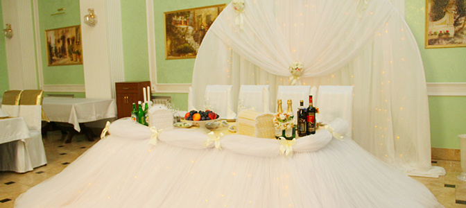 Одна из основных частей банкетного зала на свадьбе – это стол молодоженов, оформление которого должно быть выполнено безукоризненно, поскольку все внимание гостей будет приковано к нему.
