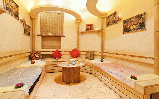 - распаривание в финской сауне-хаммаме, кедровой бочке или инфракрасной кабине (необходимо уточнять) с ингаляцией (мята, эвкалипт, лимон) — 30 минут